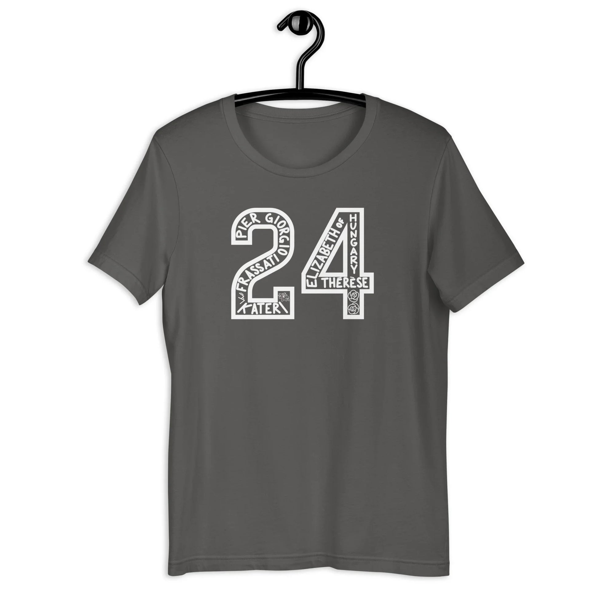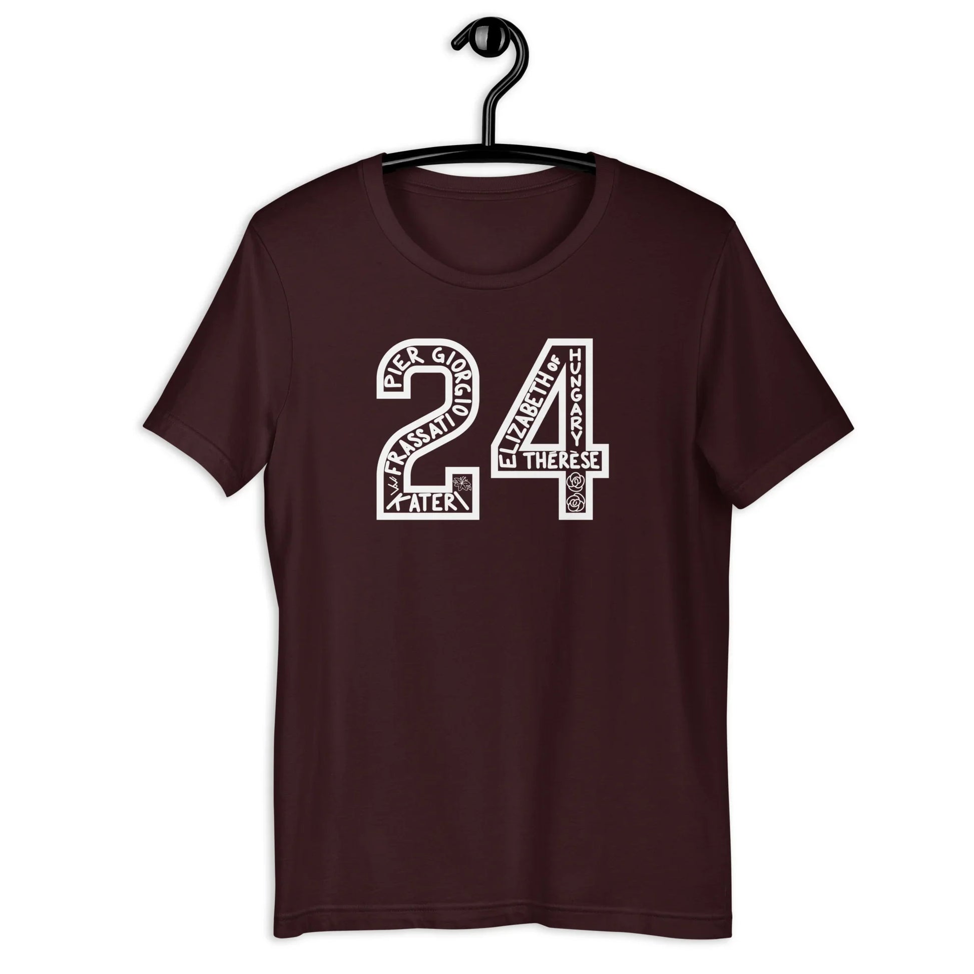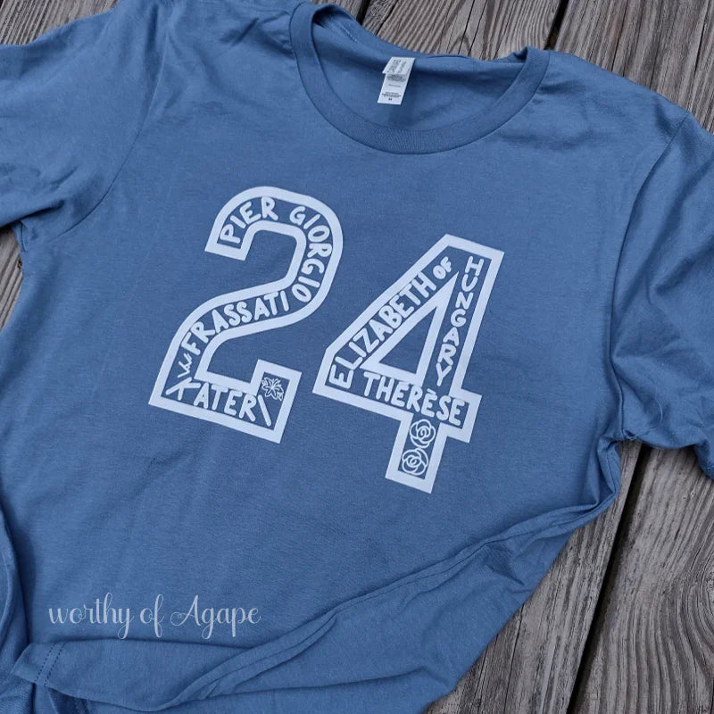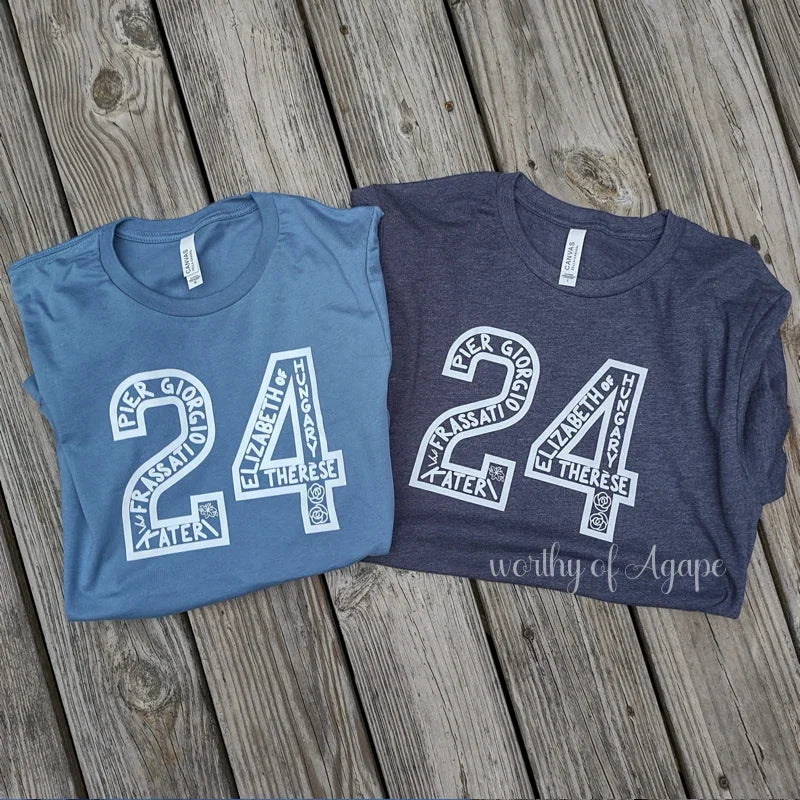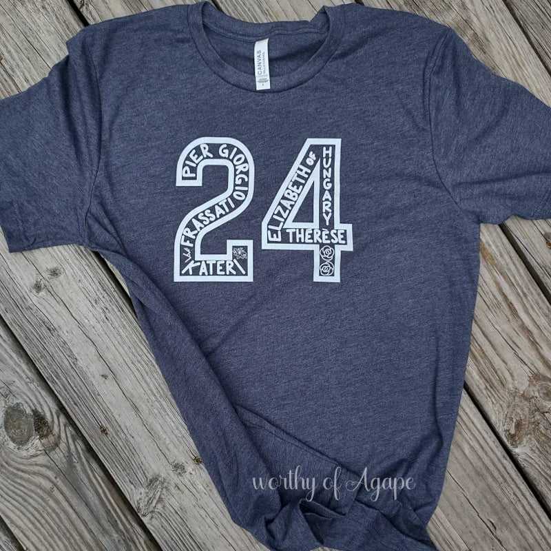This cool looking shirt easily invites and sparks conversation about the saints. Each name on the shirt belongs to a saint (or blessed) who died at the young age of 24. Despite their youth, these individuals left a legacy of holiness and continue to inspire people around the world today.