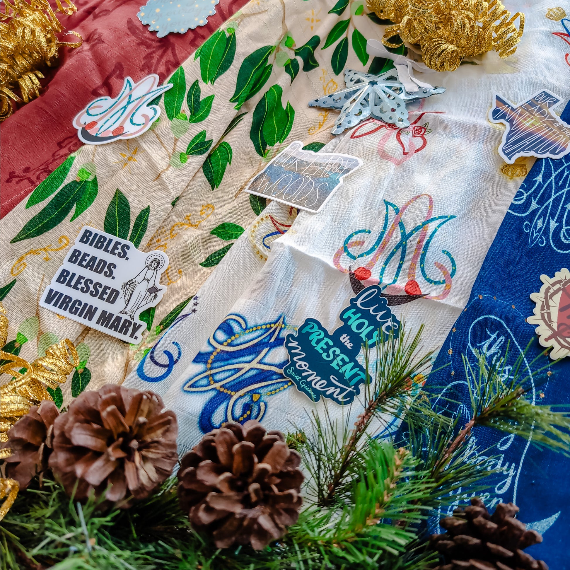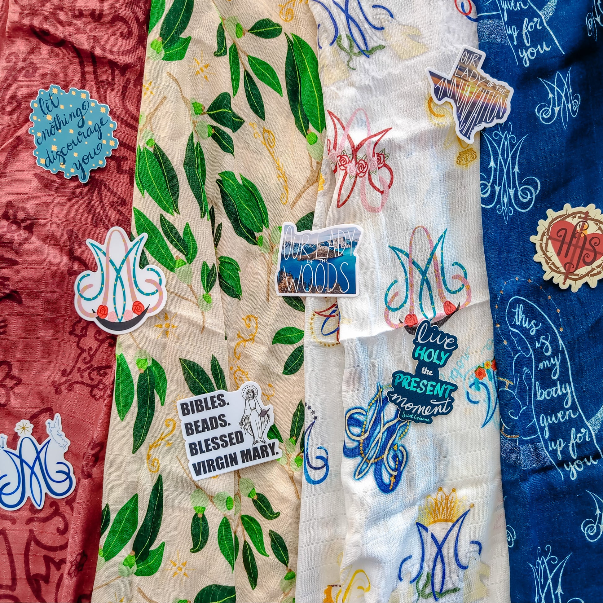 In the early days of motherhood, it’s easy to feel torn between wanting to wrap your baby in something meaningful and simply grabbing whatever swaddle is clean. This bundle helps you do both with ease—giving you beautiful, Catholic swaddles you can choose yourself and two mystery stickers chosen with care, so there’s one less decision on your plate.