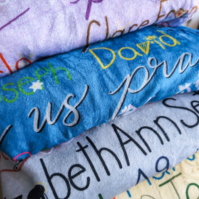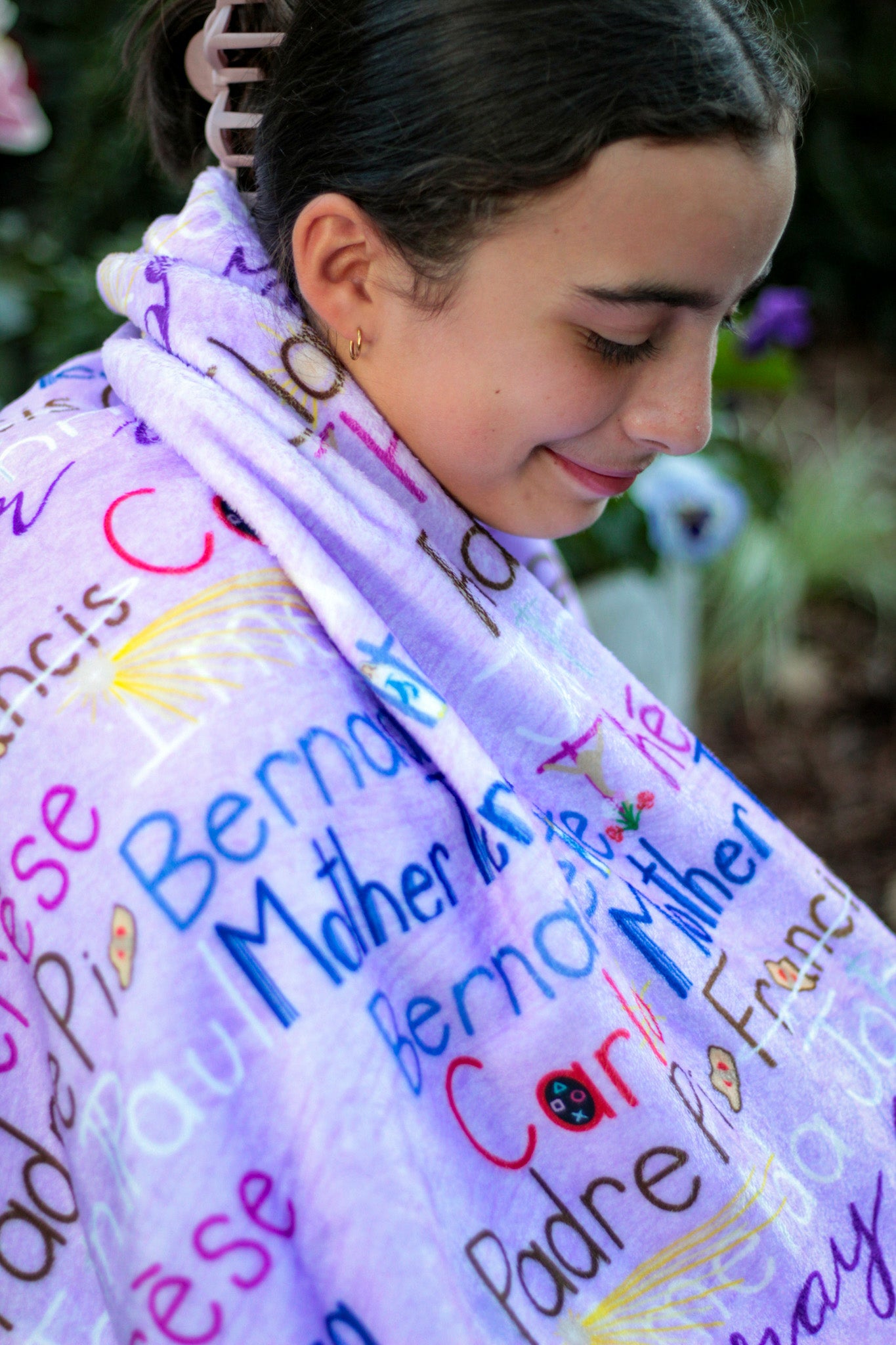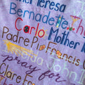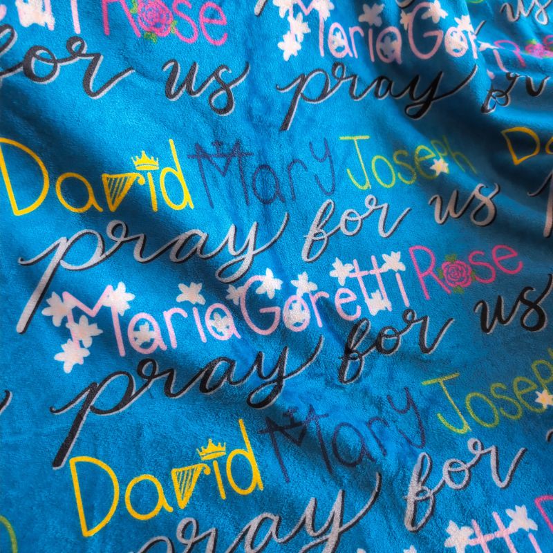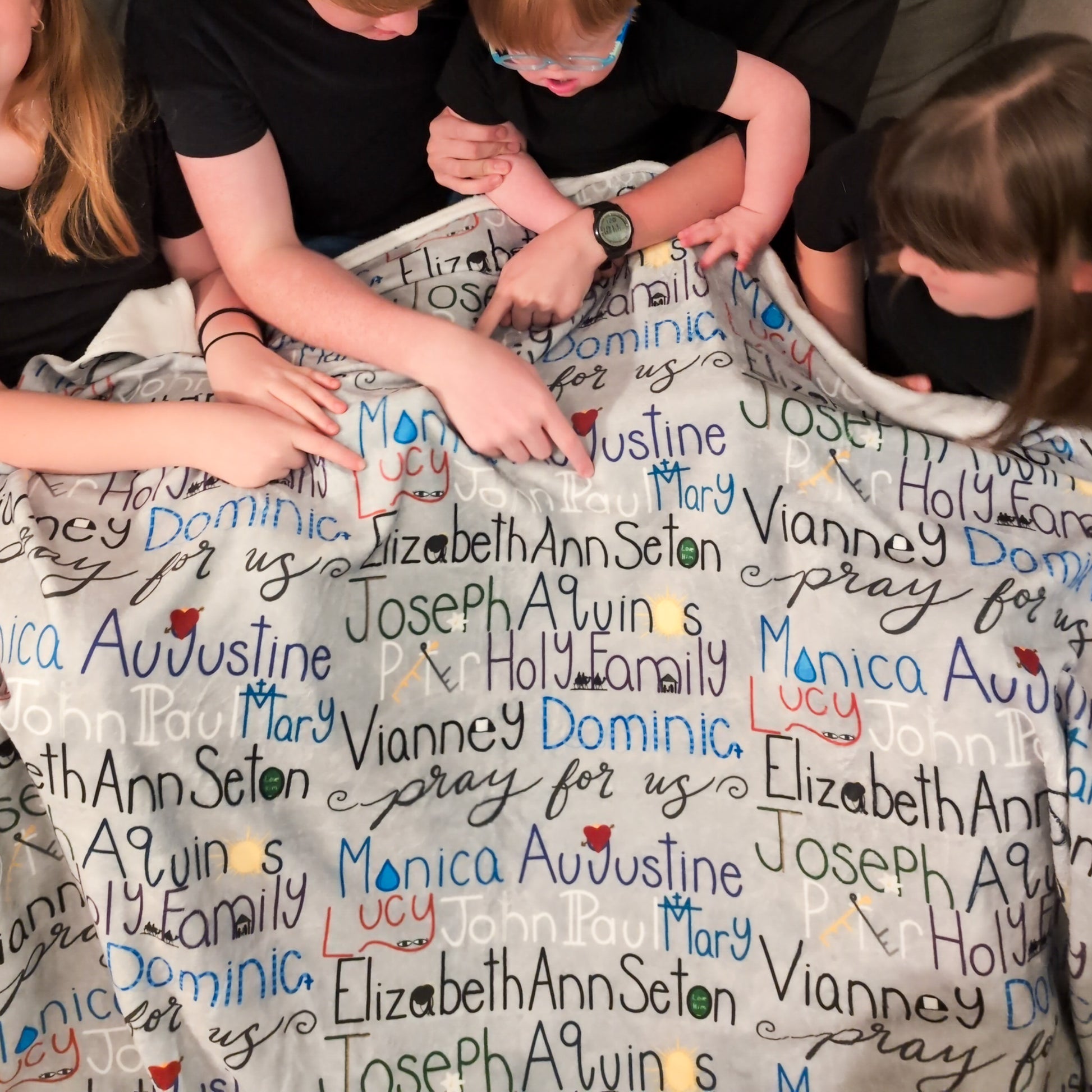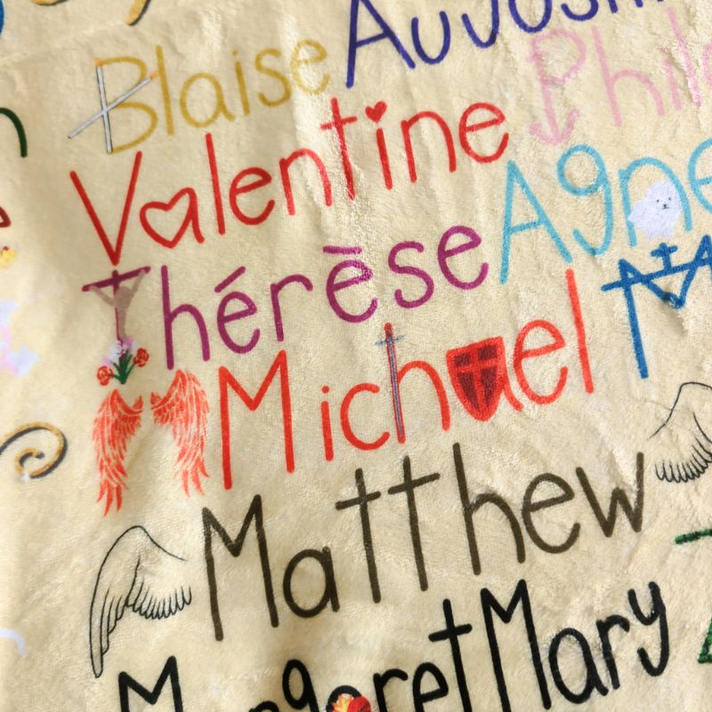 Families love how this blanket brings conversations about holiness into ordinary moments. Children trace the letters and recognize familiar names, asking questions and sharing stories. Adults find comfort in seeing their heavenly friends represented with color, care, and joy. The custom saint blanket is both a tangible reminder of faith and a gentle invitation to grow closer to those who have gone before us.