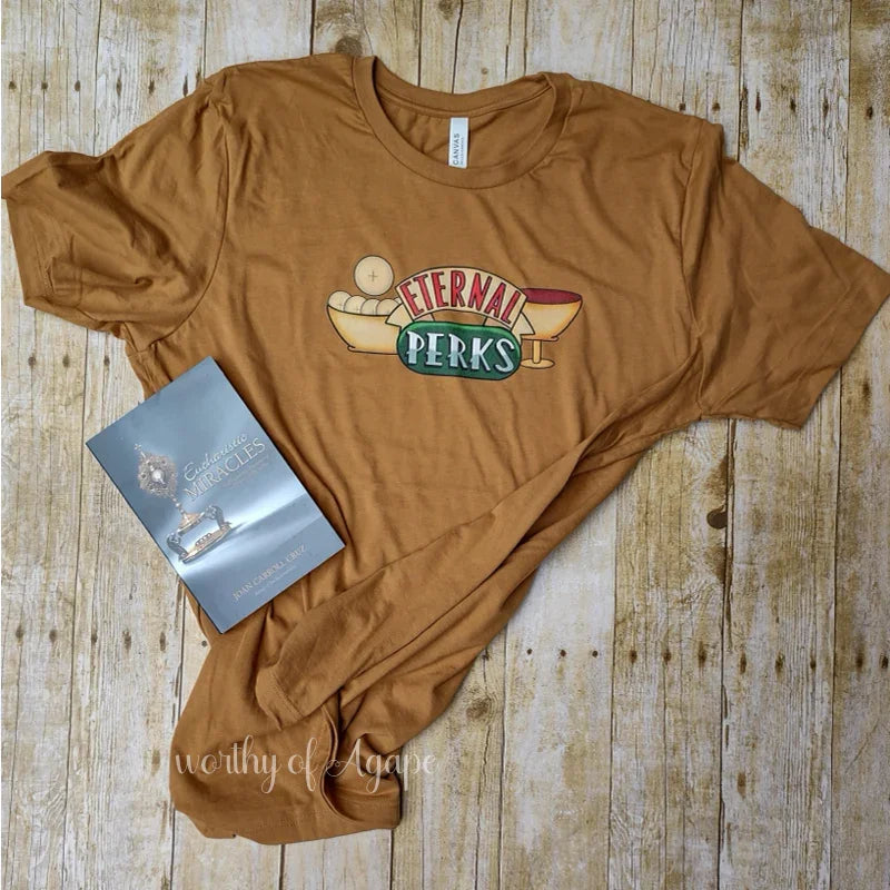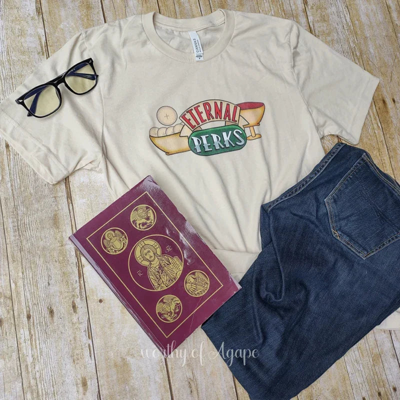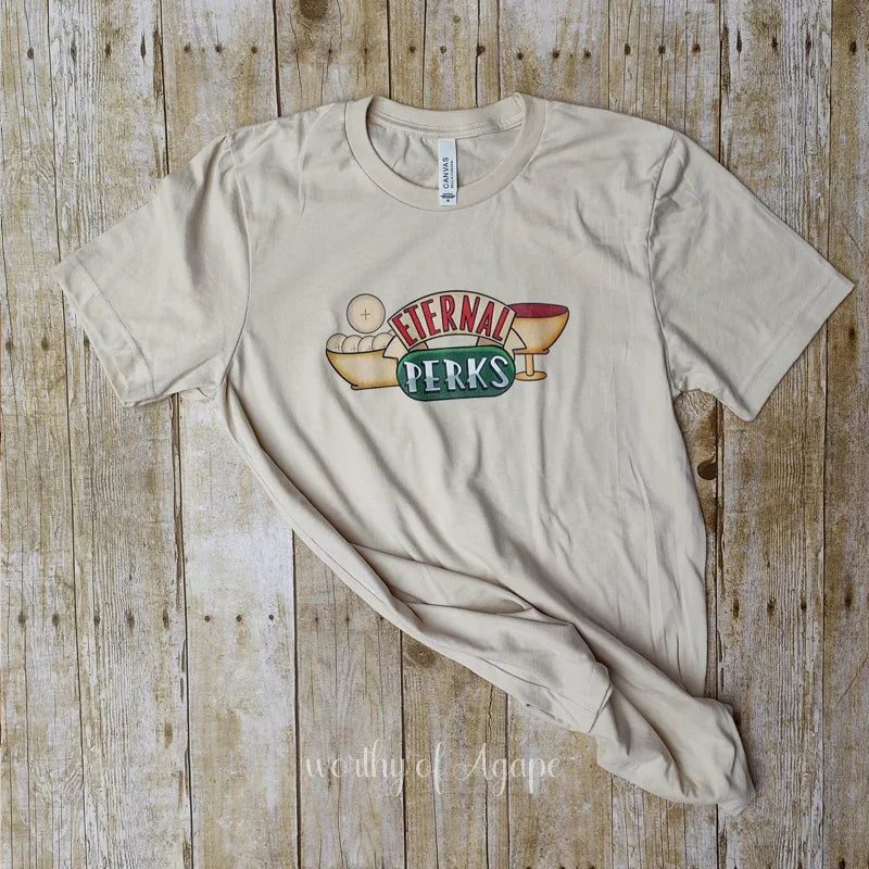 Coffee at Central Perk? Nope, this FRIENDS inspired tee puts a Catholic spin on the popular coffee shop from the hit series. Rather than coming together for coffee at a local shop, Catholics come together for eternal perks at Mass. It is at Mass, gathered together, that we are invited to the Last Supper, to share in the Eucharist.