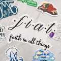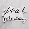 The black and white FIAT - Faith In All Things - Sticker is excellent for almost any surface. Try the vinyl sticker on your laptop, water bottle, phone case, just about anywhere you can think of! Stickers are dishwasher safe and stand up to the elements as well.