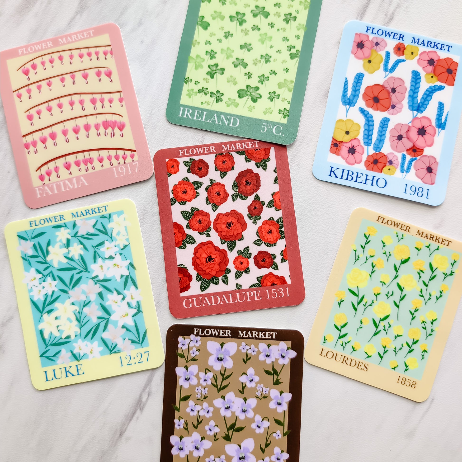 The Flower Market: Consider the Lilies sticker is part of the wider Flower Market mini-series, a growing collection of hand-drawn floral designs inspired by Marian apparitions, Scripture, and the saints. Each sticker reflects a place or moment where faith blooms. Together, the series becomes a visual prayer scattered throughout daily life.