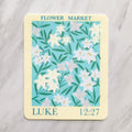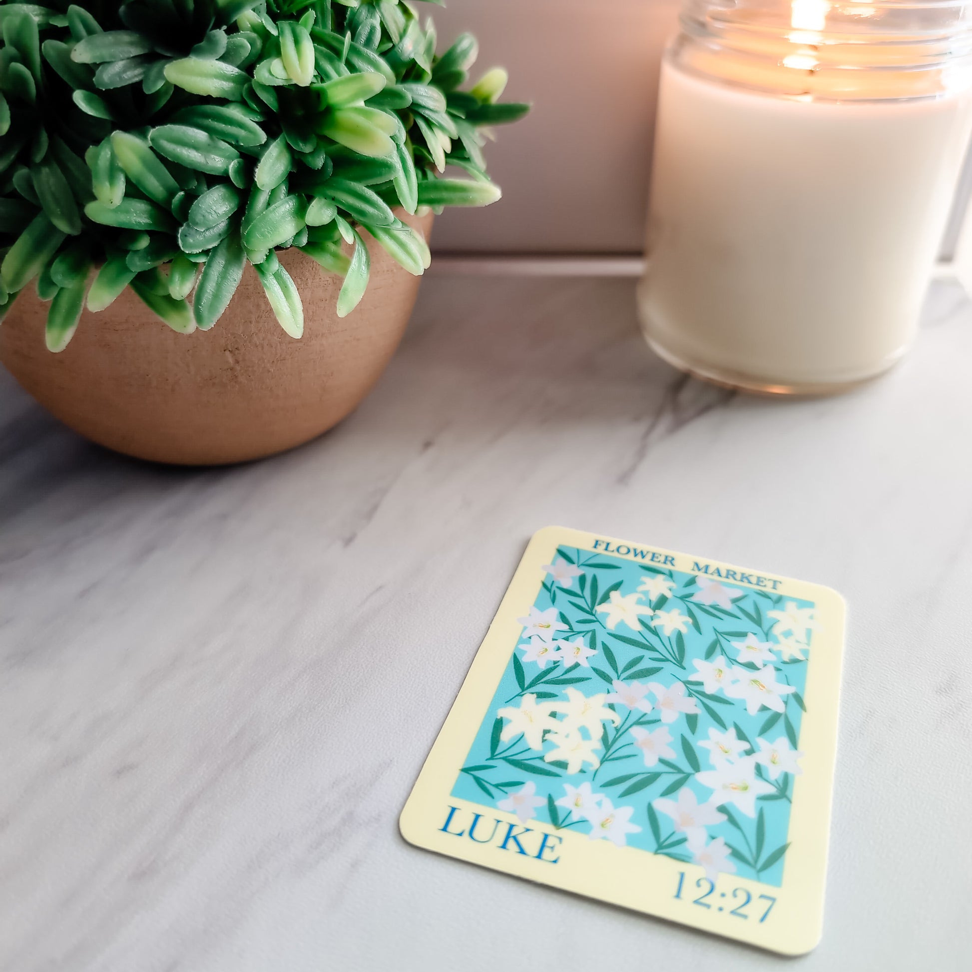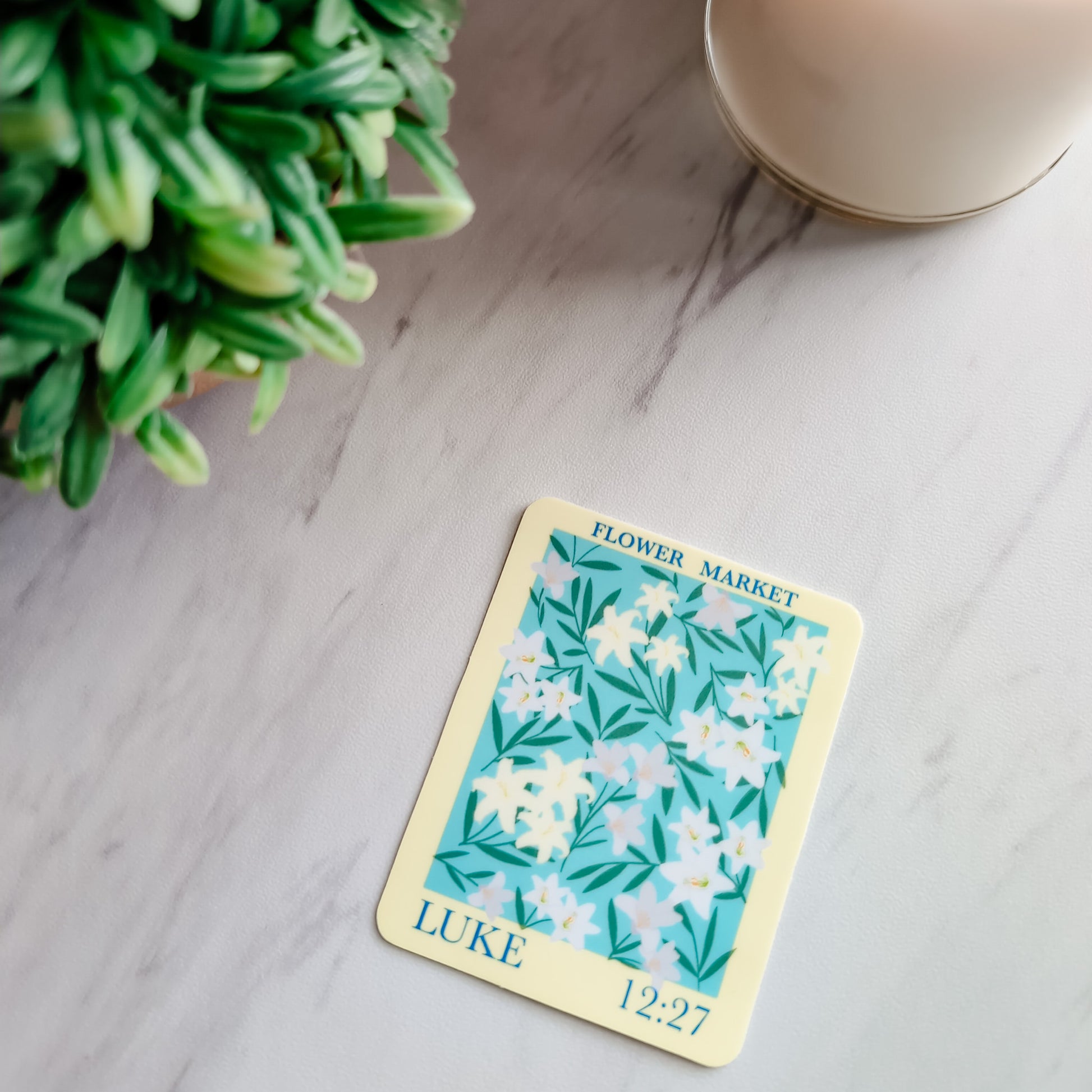 This design features a pale yellow border with a soft light teal inner background. Across the center bloom hand-drawn lilies with green stems and leaves, each illustrated with care and intention. Lilies have long symbolized trust, purity, and God’s providence. Their presence here points directly to Christ’s words and His promise of care. At the top of the sticker appear the words “Flower Market” in blue. At the bottom, the text reads “Luke 12:27,” grounding the design in Scripture rather than a place.