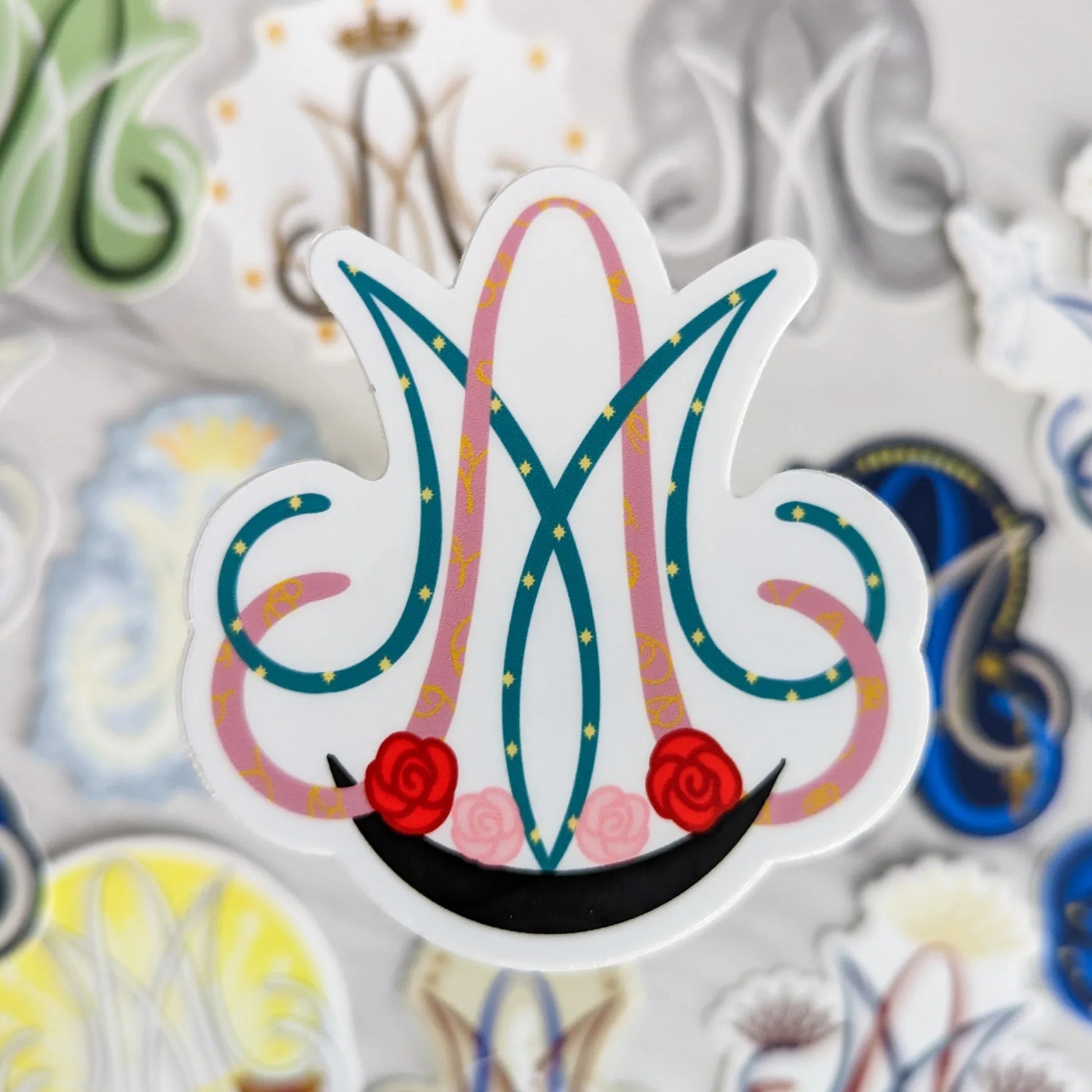 The design itself draws deeply from Catholic tradition and devotion. The central element is the classic Auspice Maria symbol, an intertwined A and M. This symbol has been used for centuries to express trust in Mary’s protection. “Auspice” means under the support or patronage, reminding us of her motherly care. The Auspice Maria sticker series brings this historic devotion into fresh and tangible form.