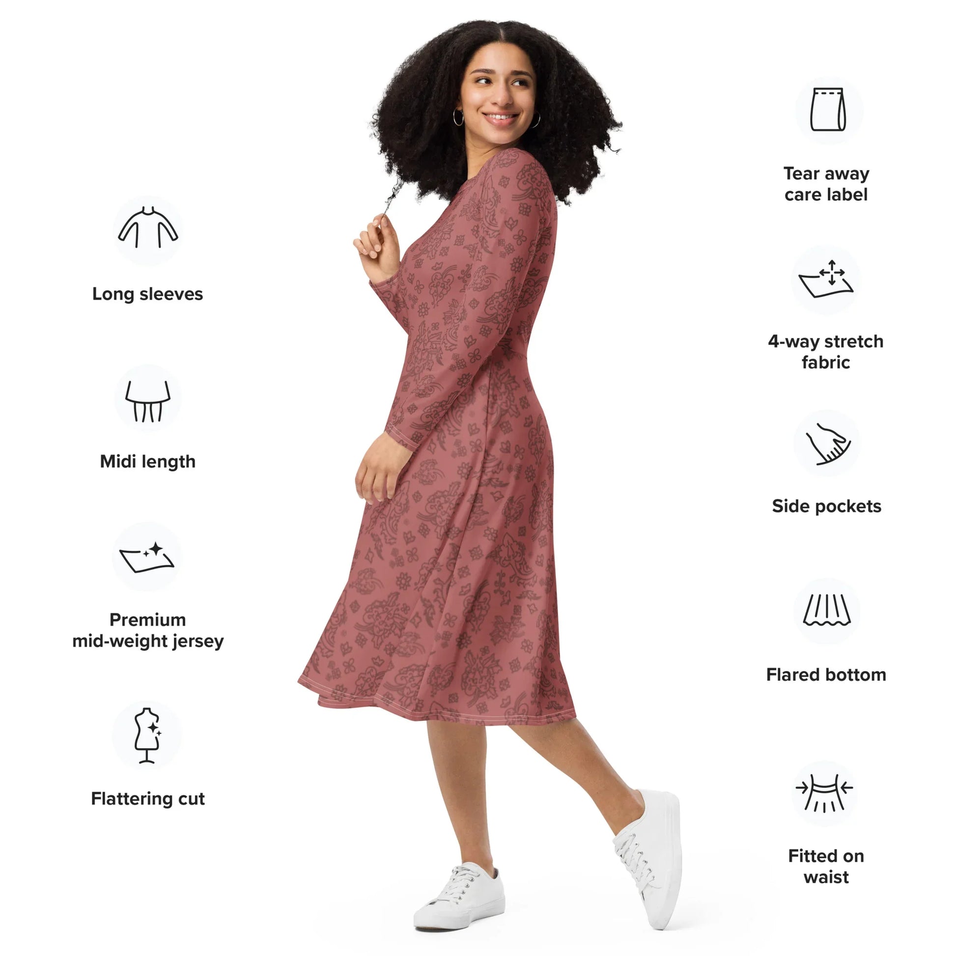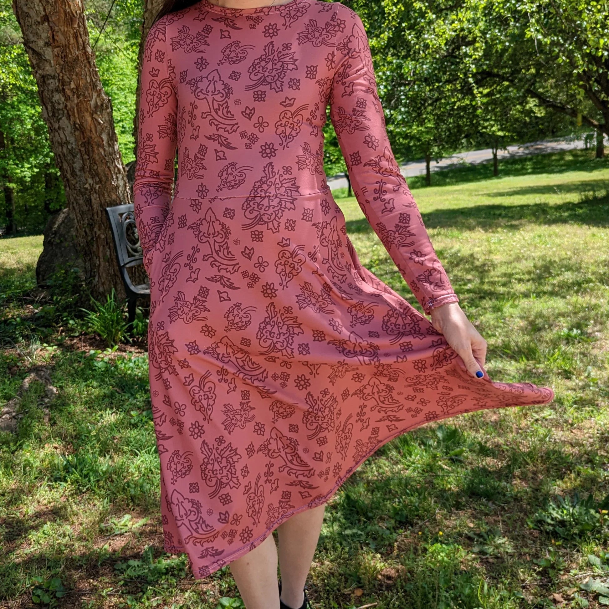 The material isn't too thick, so despite the long sleeves you could wear it year-round. Skirt length hits below the knee, and the pockets are deep enough to keep your phone, rosary, chapstick and more inside!