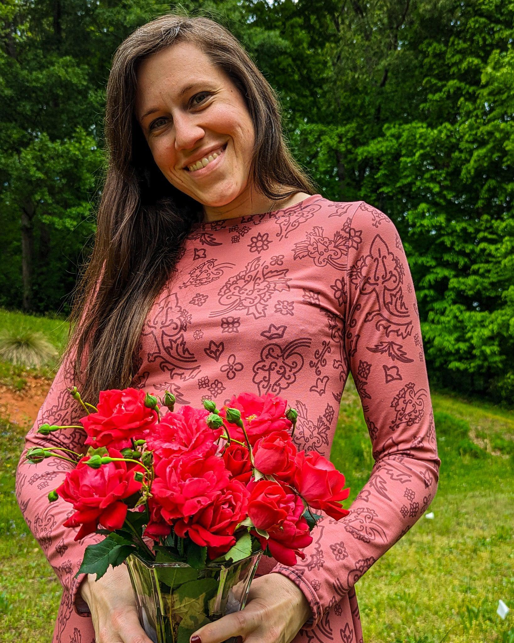 Inspired by the dress worn by Our Lady on Saint Juan Diego's miraculous tilma, this dress is designed to draw you into the heart of Mary and be beautiful.
