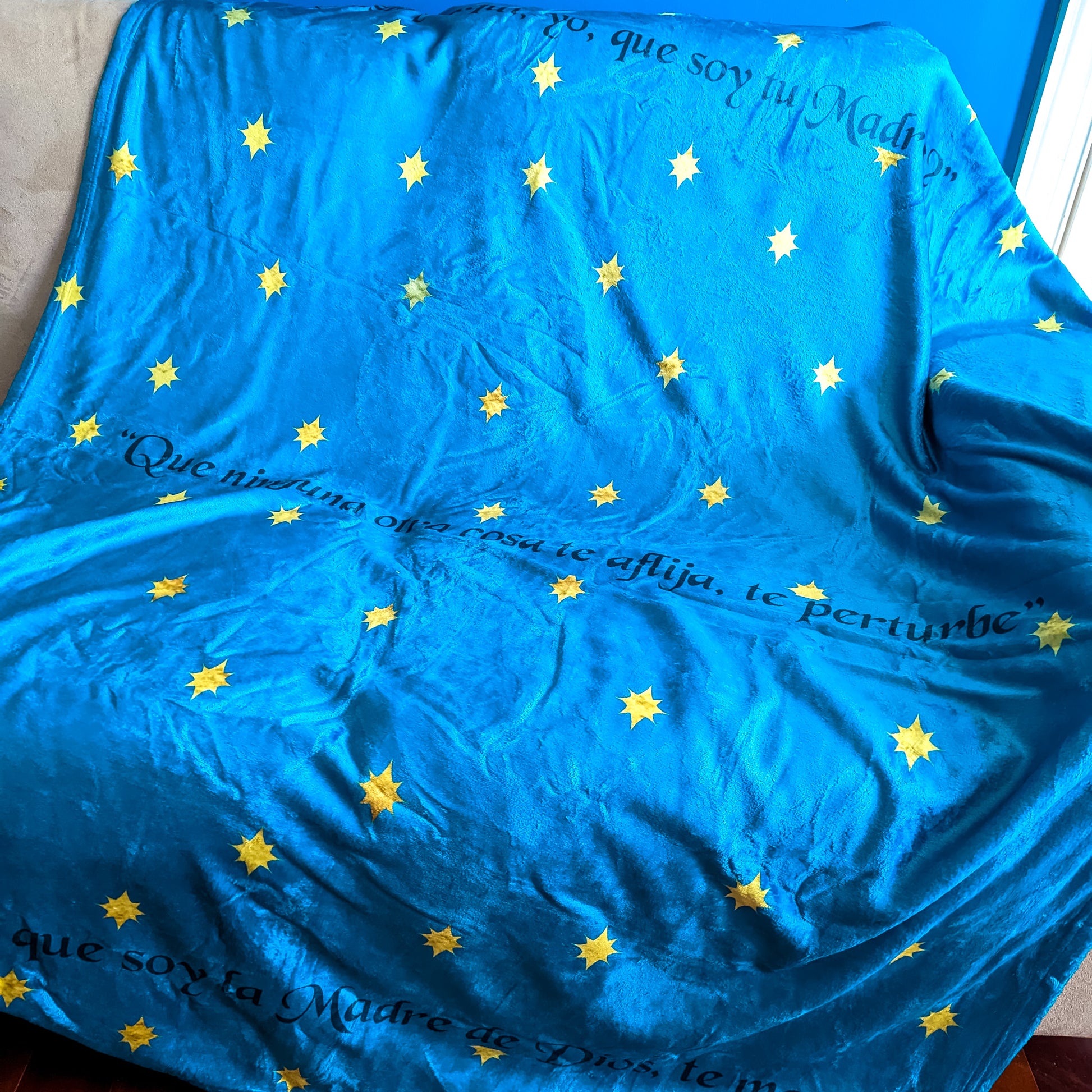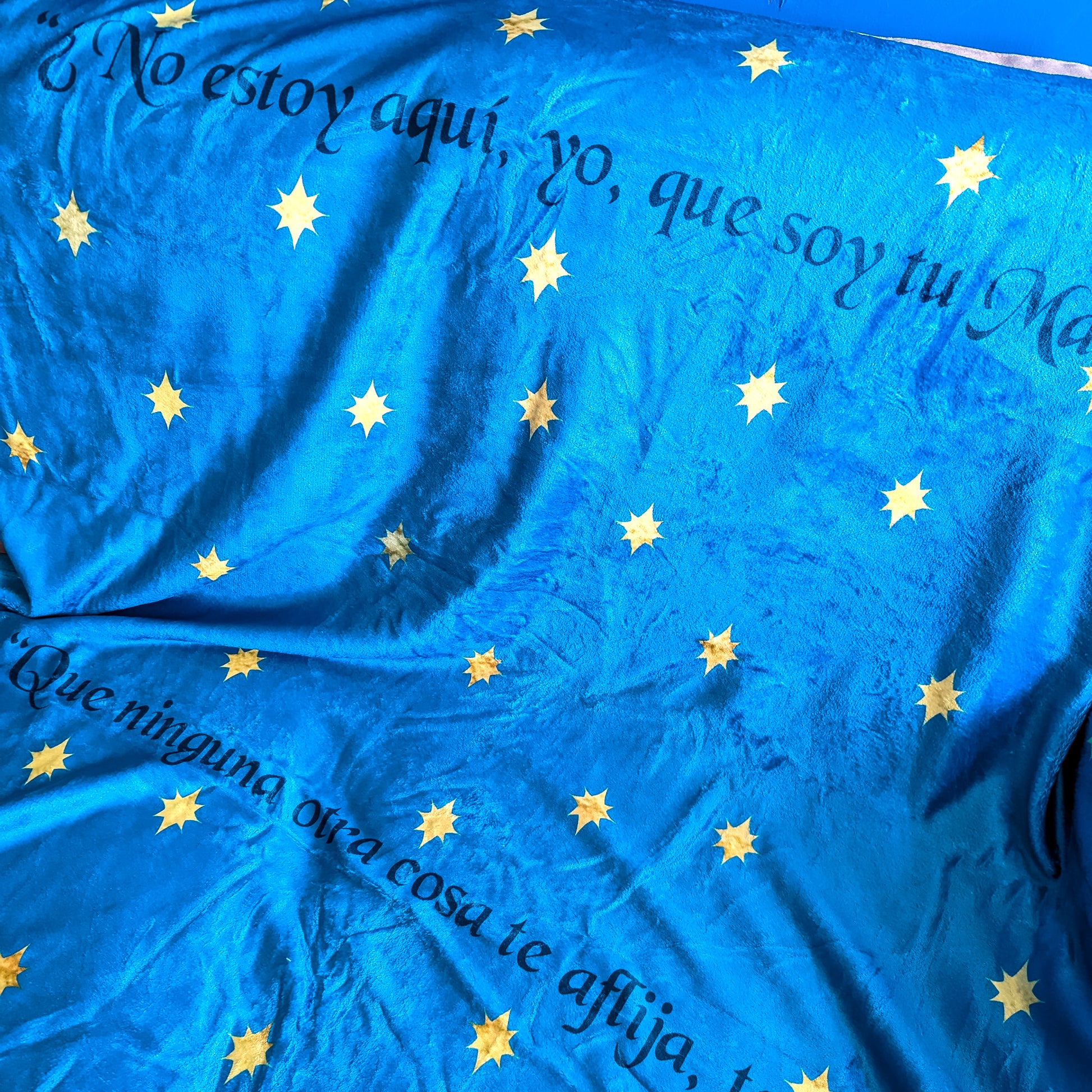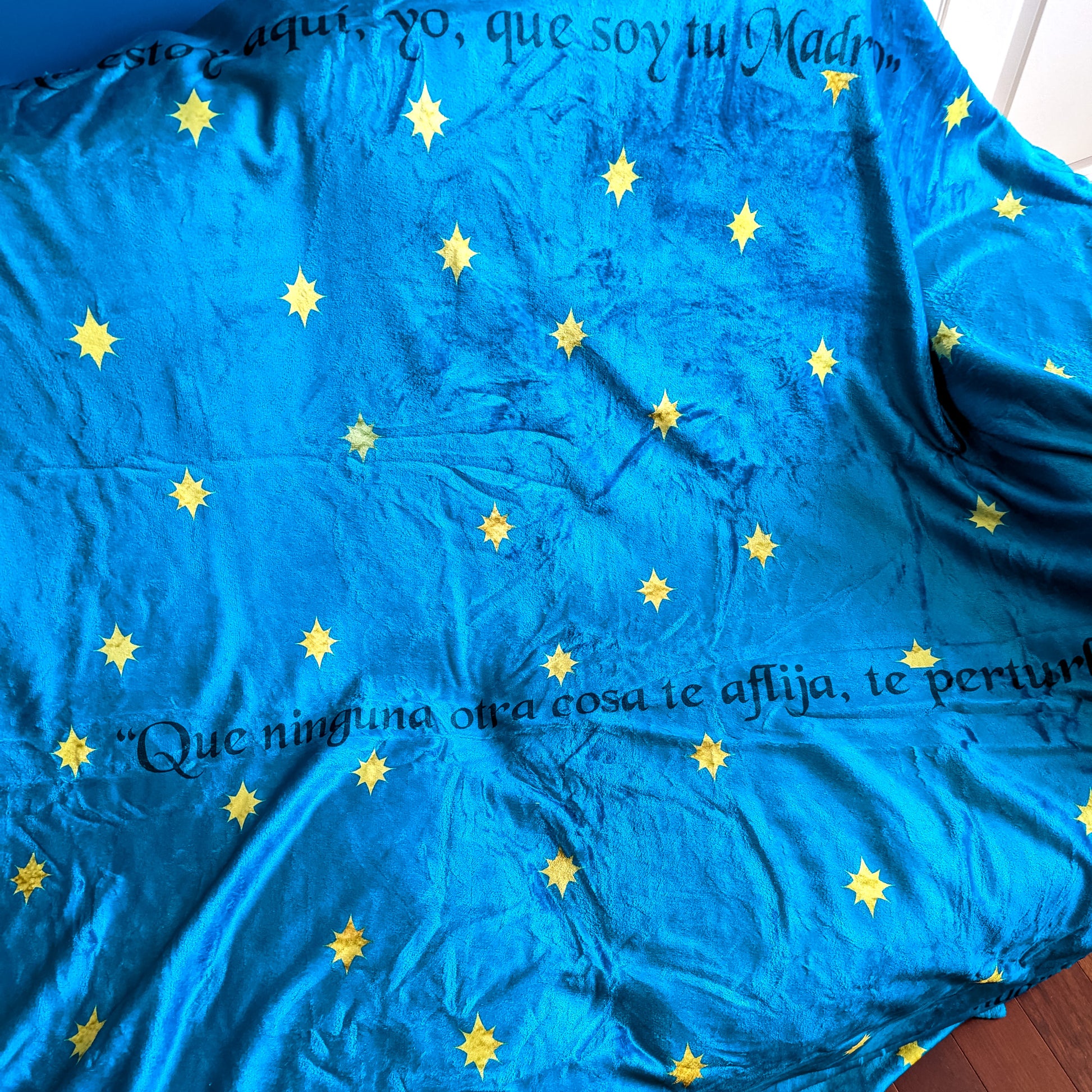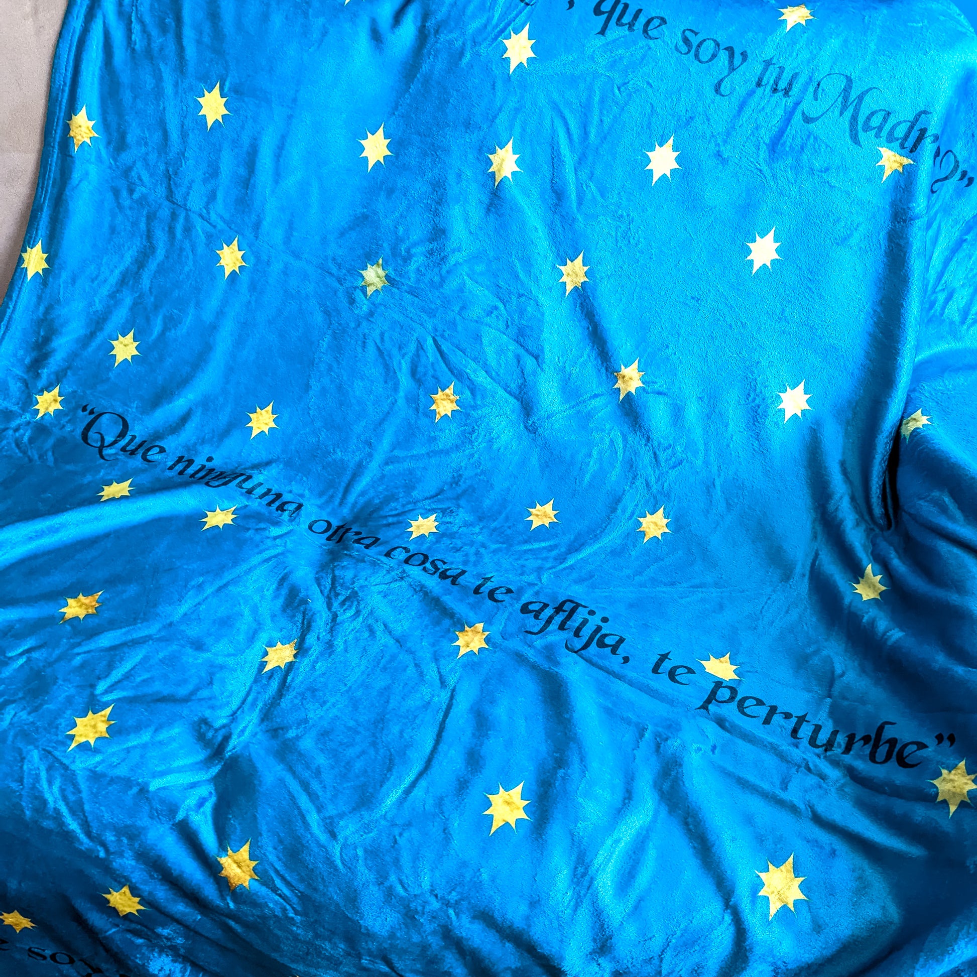 The background of the Our Lady of Guadalupe blanket features a rich, radiant teal. The background is the same hue that covers her heavenly mantle. Woven across that calming color are delicate, golden eight-pointed stars. These stars aren’t just decorative; they echo the very ones that appeared supernaturally on her garment—tiny testaments of heaven’s nearness and her maternal presence.