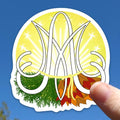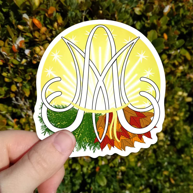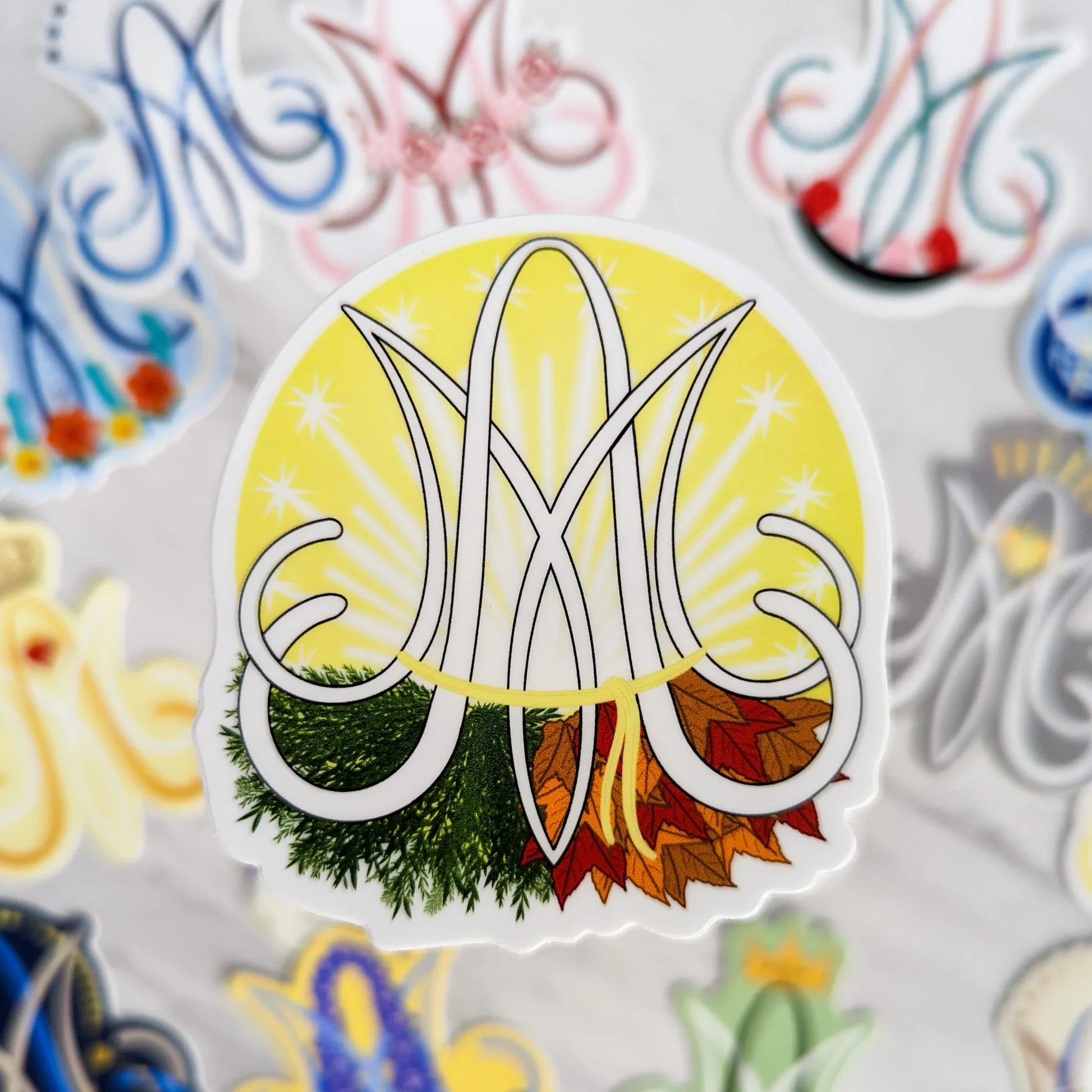 The sticker design boasts a joyful yellow background with twelve stars for Mary's crown, evoking a sense of warmth and holiness. Against this vibrant backdrop, a radiant white A and M, as Our Lady appeared in brilliant white clothing. Behind the A and M are hemlock (on the left) and maple (on the right). Between those two trees, Adele Brise saw Our Lady appear. Additionally, at the Shrine of Our Lady of Champion - also called Our Lady of Good Help - there is a stained glass window featuring these two trees as well.