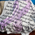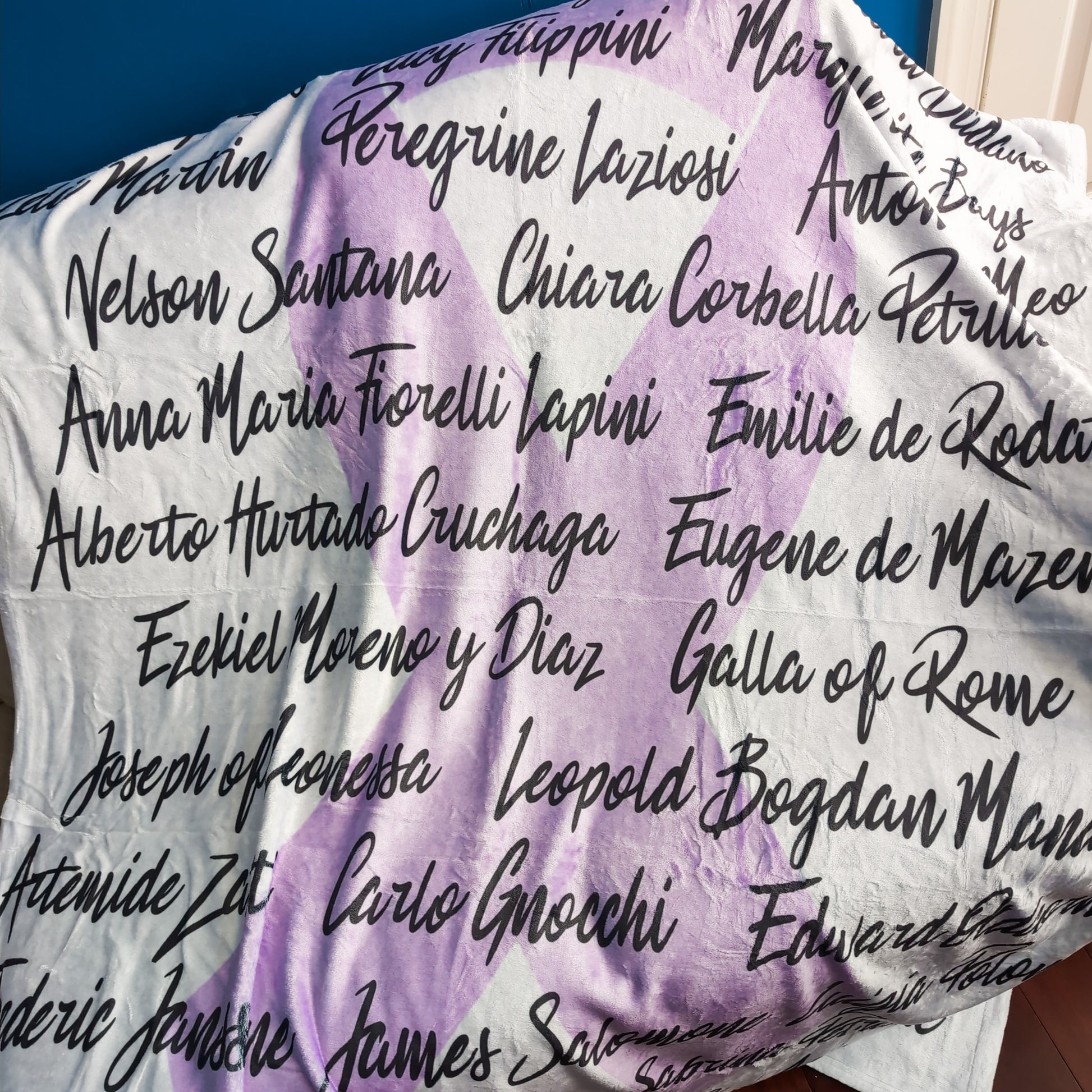 This super soft, minky blanket measures 50'' x 60'' and is the most snuggly blanket around. Not to mention that this blanket features the names of Catholics who all had cancer.