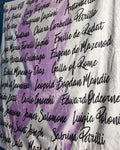 Behind the names of the holy men and women is a light purple ribbon, representative of all cancers.